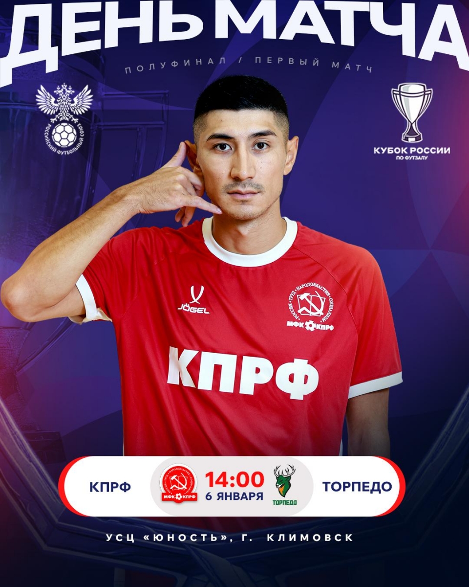 Сегодня мини-футбольный клуб КПРФ в своем первом матче в 2026-м году будет принимать "Торпедо". Этот поединок - первый полуфинал Кубка России, трофея, действующим обладателем которого является наша команда.