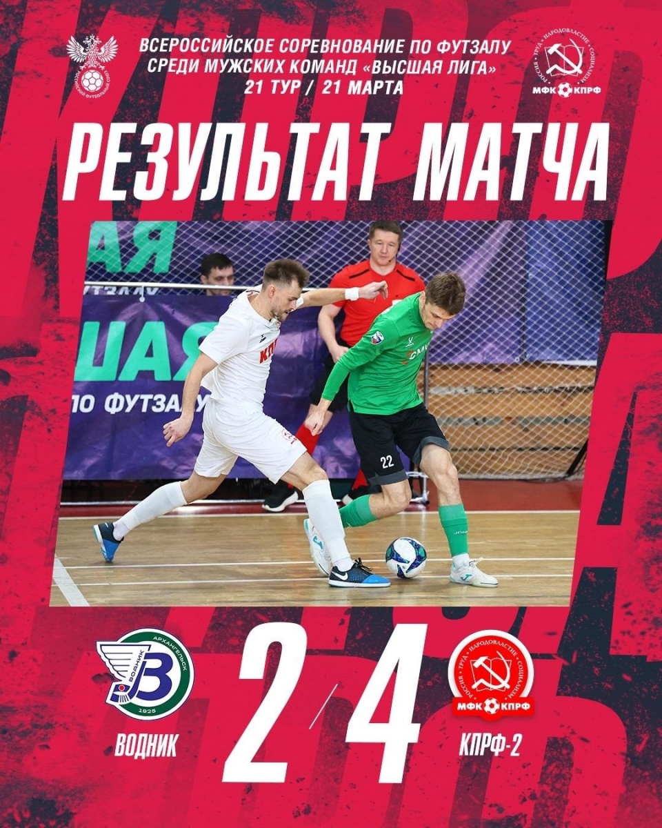 В рамках матча 21-го тура Высшей Лиги подопечные Андрея Юдина встречались в Архангельске с местным «Водником». Встреча осталась за «КПРФ-2».