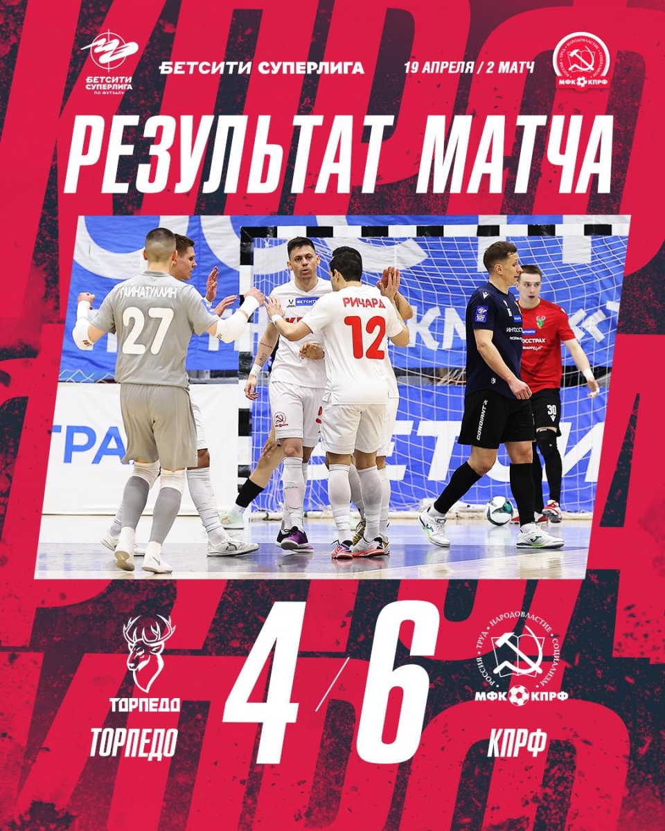 МФК КПРФ образцово-показательно начал встречу, дважды забив уже в первые полторы минуты. Хозяева делали всё, чтобы отыграться, но коммунистический коллектив каждый раз восстанавливал преимущество в два мяча. А во второй половине, когда «торпедовцы» остались в меньшинстве, МФК КПРФ довел свое преимущество до трех голов – 6-3.