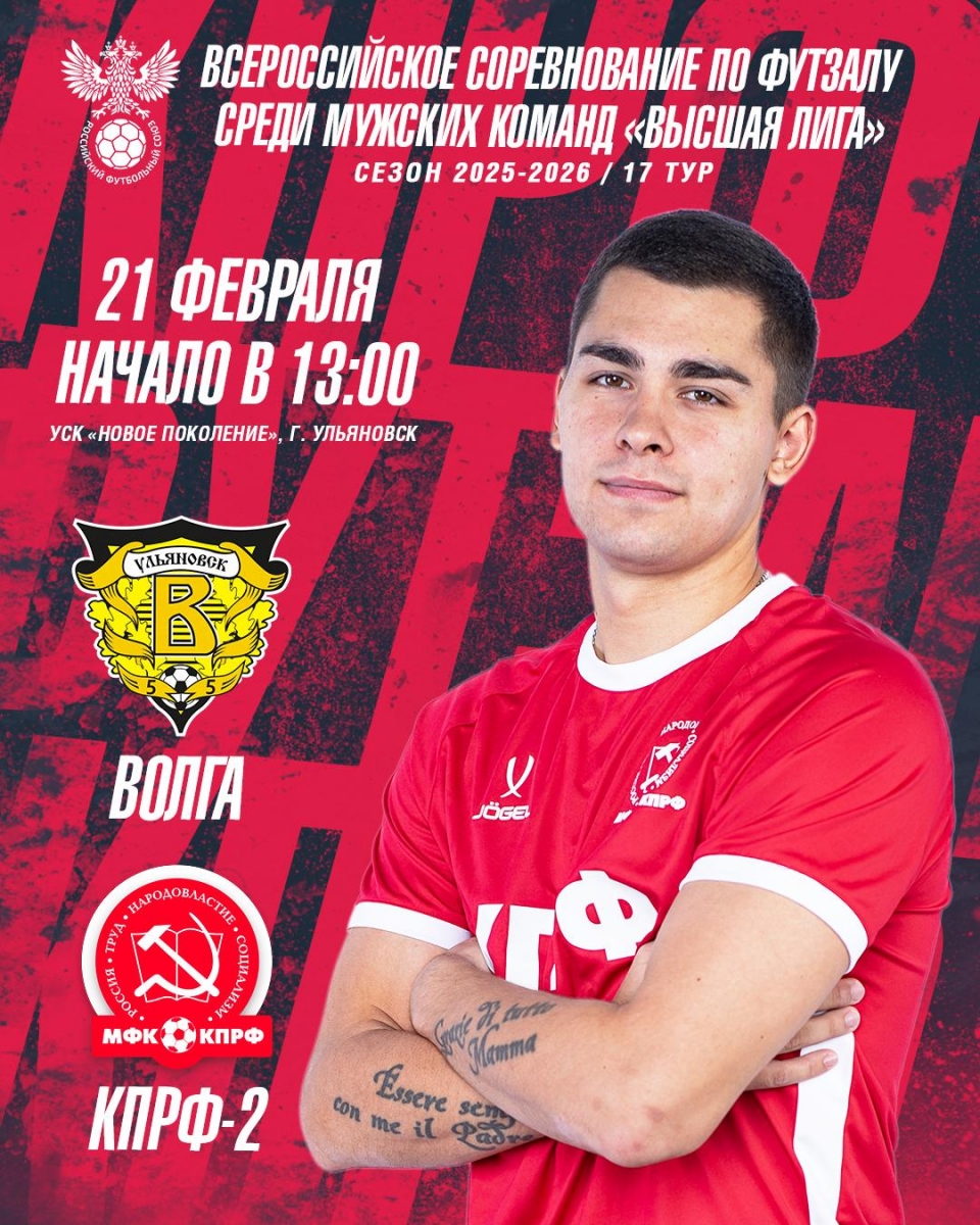 Матч «Волга» - «КПРФ-2» состоится в субботу, 21-го февраля, в УСК «Новое поколение» (г.Ульяновск), начало 13:00 (мск).