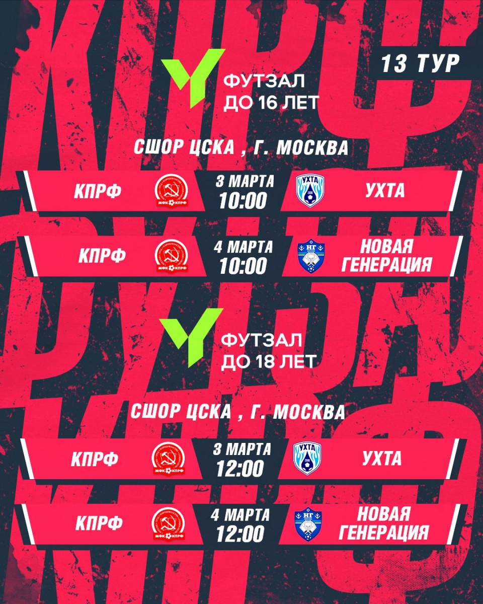 "Арсенал-КПРФ" и "Красная гвардия" сыграют на площадке ЦСКА 27.02.2026, 08:15 "Арсенал-КПРФ" и "Красная гвардия" сыграют на площадке ЦСКА Молодым командам СК КПРФ предстоит поединки с "Ухтой" и "Новой генерацией".