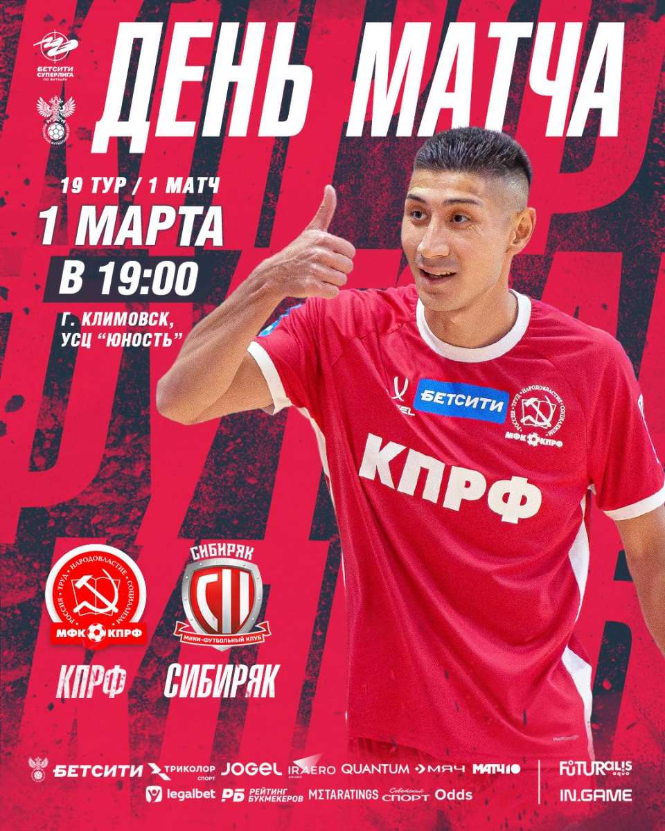 В воскресенье и понедельник мини-футбольный клуб КПРФ будет в УСЦ "Юность" принимать "Сибиряк" в матчах 19-го тура чемпионата Бетсити Суперлиги. Прямые трансляции смотрите на "Триколоре".