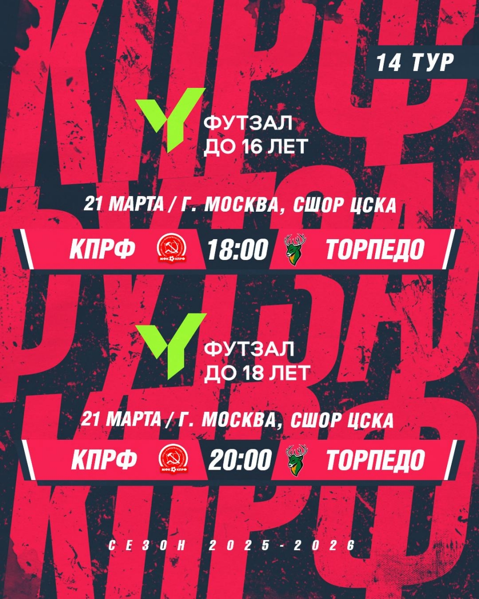 «Арсенал-КПРФ» и «Красная гвардия» сразятся с «Торпедо» 18.03.2026, 09:26 «Арсенал-КПРФ» и «Красная гвардия» сразятся с «Торпедо». Матчи ЮФЛ-16 и ЮФЛ-18 пройдут на площадке ЦСКА в эту субботу.