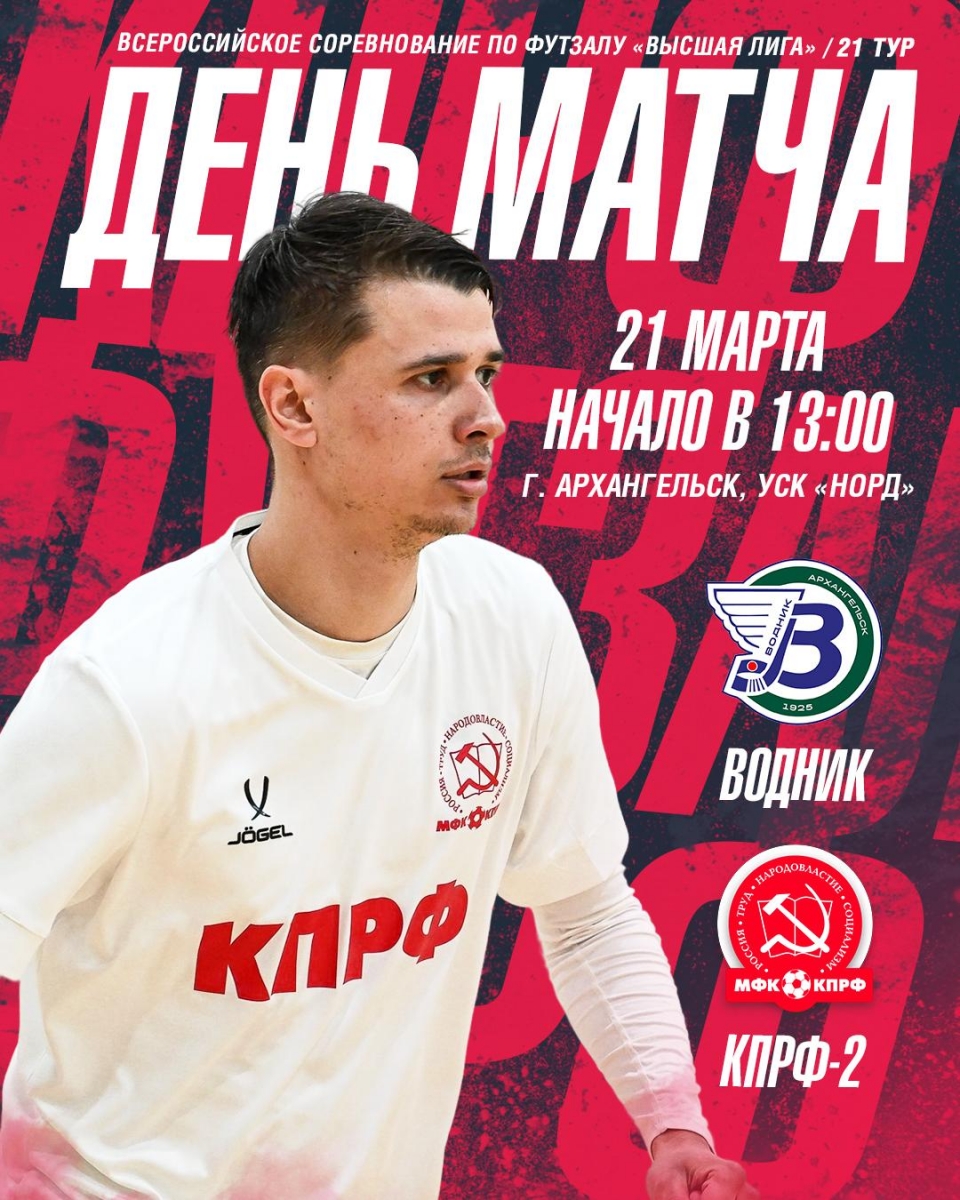 Сегодня "КПРФ-2" проведет заключительный выездной матч регулярного чемпионата Высшей лиги. Соперник - "Водник". Матч пройдет в Архангельске, в "Норд Арене", начало - 13:00 (мск).