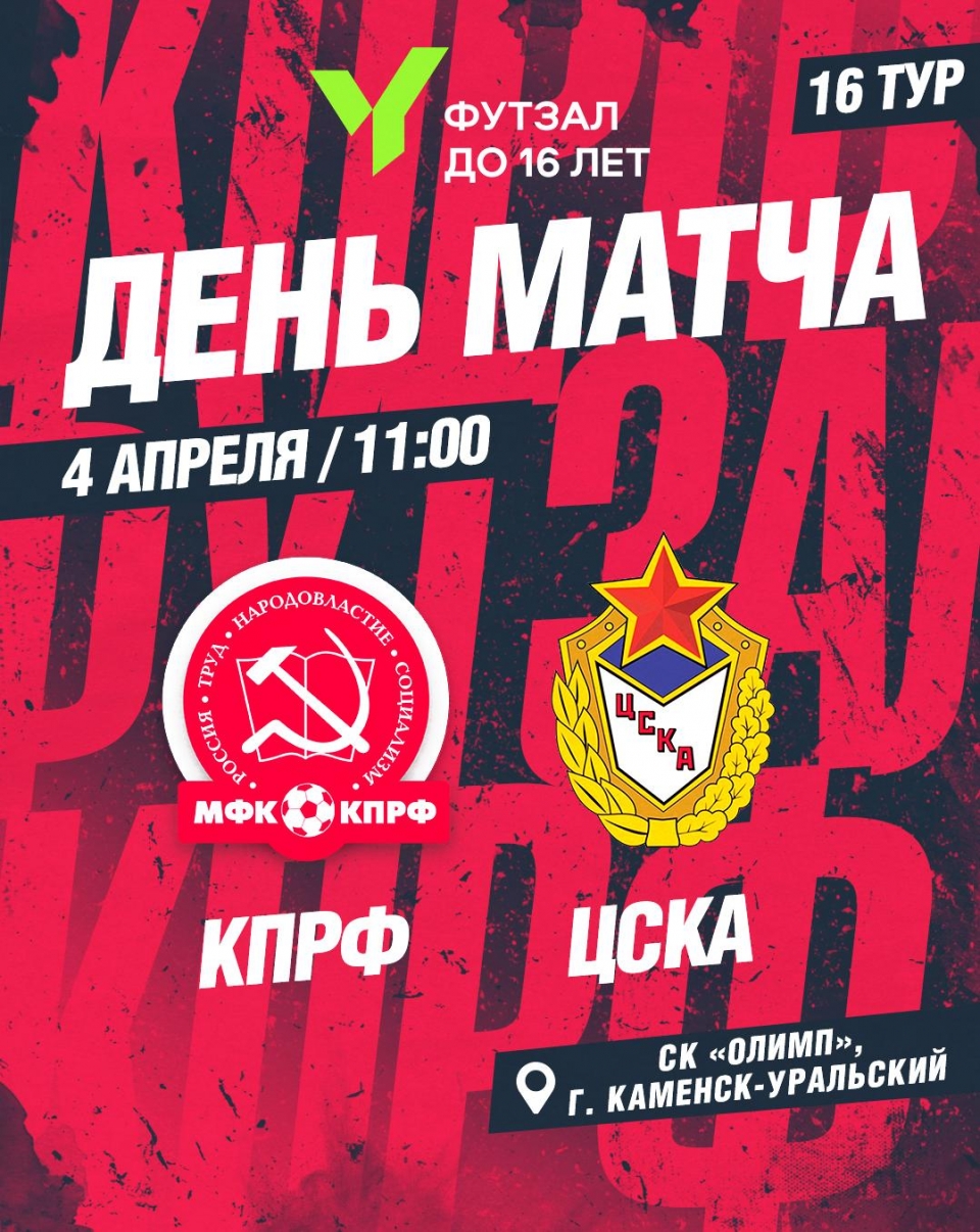 "Арсенал-КПРФ" - ЦСКА: прямой эфир! 04.04.2026, 07:59 Сегодня "Арсенал-КПРФ" проведет заключительный матч чемпионата ЮФЛ-16. В СК "Олимп" (г.Каменск-Уральский) наша команда будет принимать ЦСКА. Начало матча - 11:00 (мск). Прямую трансляцию смотрите в VK