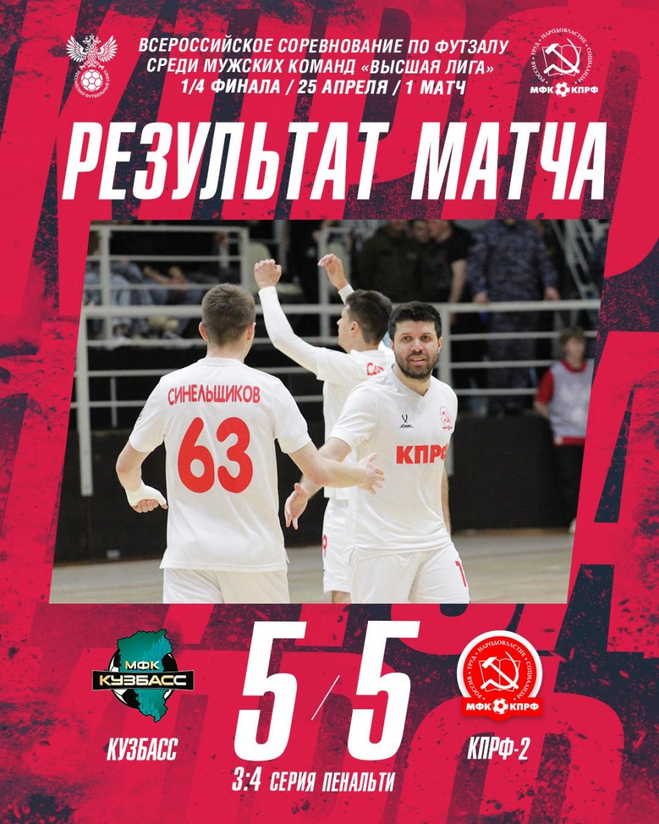 «Кузбасс» преобразился во второй половине, сумев сравнять счет и перевести встречу в овертайм. Там кемеровчане вышли вперед, и геройствовать пришлось уже «КПРФ-2». На последней минуте второго овертайма отличился Руслан Курбанов – 5-5 и серия пенальти!
